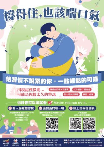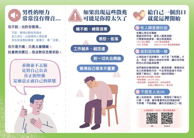 鑑於男性自殺率逐年攀升男性關懷且多數個案於首次通報時即已死亡,研判與男性較不願主動求助之文化因素相關。為此,臺南市政府衛生局製作「男性關懷」系列海報及單張,宣導男性關懷專線及心理健康相關資源,以破除「求助即為軟弱」等迷思,並鼓勵男性提升自我覺察、善用心理健康支持管道。