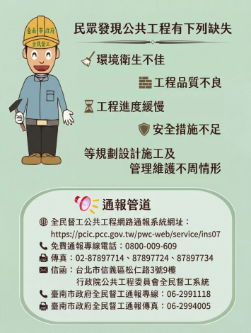 【宣導】公共工程要更好,全民督工不可少,歡迎使用全民督工行動版通報網頁,快速通報又便捷,臺南市政府關心您。